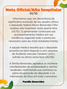 “Informamos que, em decorrência da significativa evolução do seu quadro clínico, o deputado federal Mauro Benevides Filho recebeu alta hospitalar nesta quarta-feira (01/10). O parlamentar continuará sob acompanhamento médico em sua residência, seguindo todo o protocolo necessário para seu total restabelecimento”.