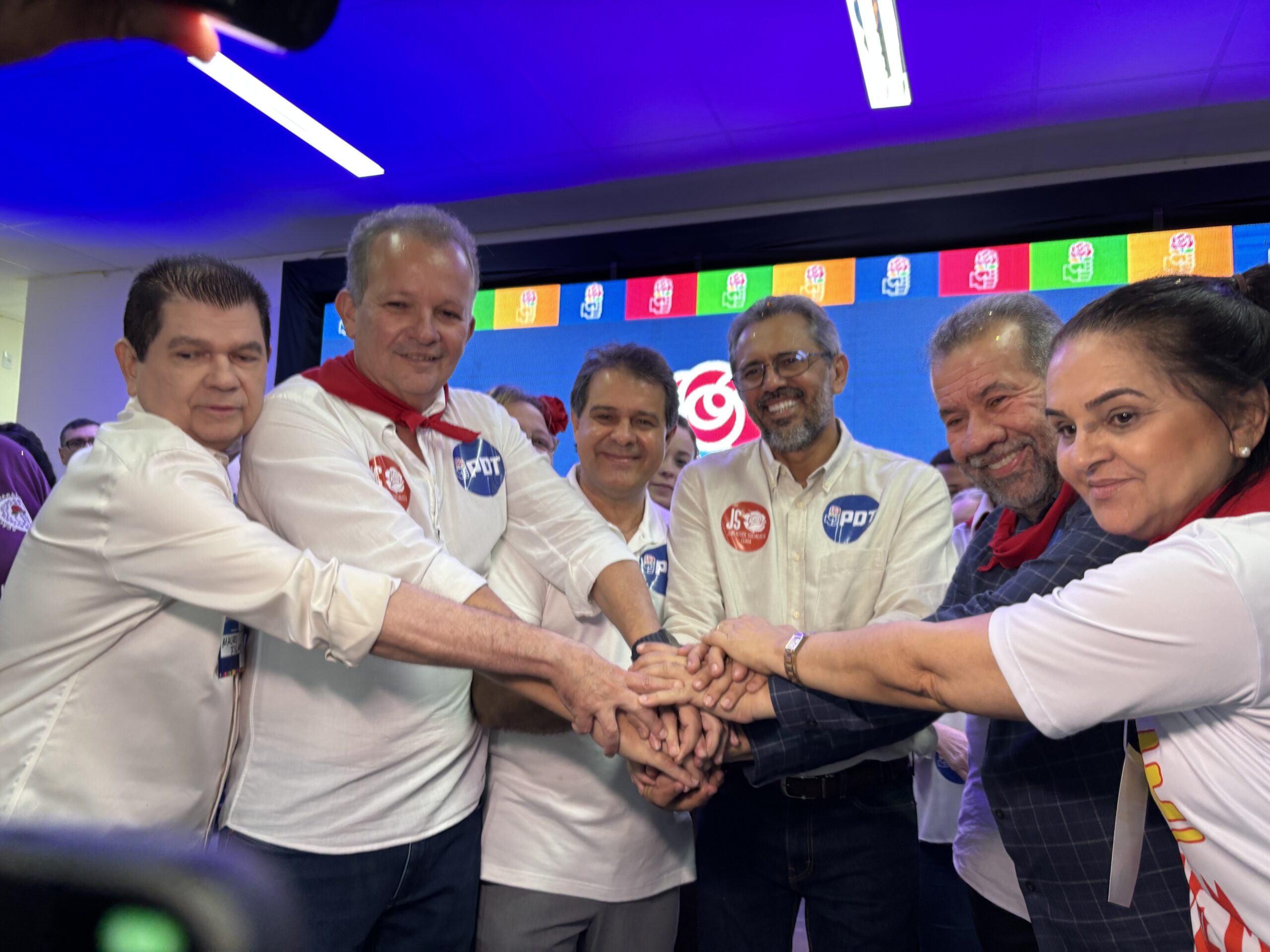 O governador do Ceará, Elmano de Freitas (PT), é o prefeito de Fortaleza, Evandro Leitão (PT), compareceram à convenção do PDT, nesta sábado (1), na Academia do Professor. No evento, os petistas reforçaram a Aliança do Campo Progressista se comprometeram com a eleição de deputados estaduais e federais pedetistas em 2026.